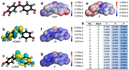 (a) Optimized structure of BHPM; (b,c) HOMO and LUMO; (d) ESP; (e–g) electron density mapped by f−, f0, f+ (iso-surface value = 0.03 electrons/Å3); and (h) Fukui indices of BHPM.
