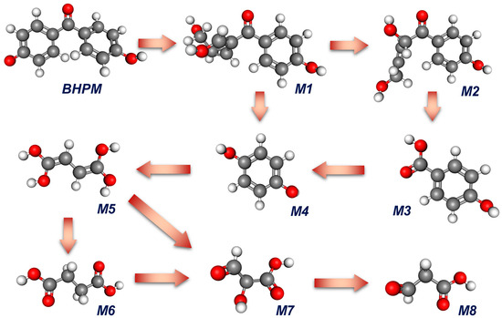To elucidate the possible degradation pathway of the BHPM by MCF + Oxone, a mass spectrometry of BHPM degradation intermediates (Figure S5 and Table S2) was then acquired and integrated with the aforementioned information on computational chemistry to depict a possible degradation process in Figure 11. Initially, the benzene ring of the BHPM, where the HOMO is located, could receive a ring-opening attack to generate an intermediate, M1, which would then transform to M2 upon continuous oxidations. Next, M2 would be decomposed to eliminate the ring-opened residual group to produce M3, which would encounter continuous oxidations to afford M4. Upon further attacks, M4 would then be degraded by another ring-opening reaction to generate M5, which then would be consecutively decomposed to produce low-molecule-weight intermediates, such as M5, M6, and finally M7.