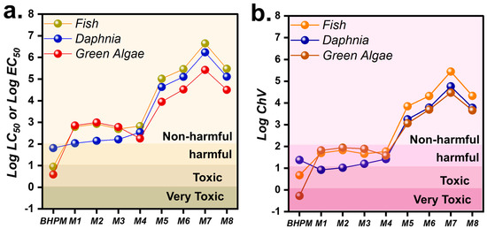 Eco-toxicity evaluation of BHPM degradation by the ECOSAR: (a) acute toxicities; (b) chronic toxicities.