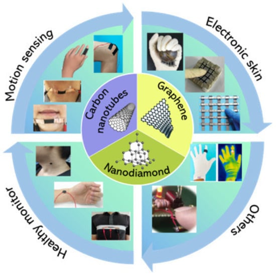 In harsh and demanding environments, the need for reliable and resilient sensors to monitor mechanical strain becomes paramount. Carbon materials, including carbon nanotubes, graphene, and nanodiamonds, offer cutting-edge solutions as strain sensors in such challenging conditions. In Table 1, a comparison of the electrical conductivity, thermal conductivity, Young’s modulus, crystal lattice parameters, and band gap of carbon nanotubes (CNTs), graphene, and nanodiamonds is listed [71,72,73,74,75,76,77,78,79,80,81,82,83]. Those carbon materials possess unique superiorities such as good electrical conductivity, high chemical and thermal stability, excellent mechanical property, low toxicity, as well as ease to be functionalized, endowing them with great potentiality for applications as strain sensors (Figure 1). These advanced carbon-based materials possess exceptional properties that enable them to withstand extreme temperatures, corrosive substances, and mechanical stress while accurately detecting and measuring strain.