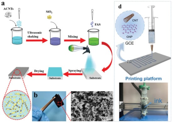 (a) Schematic diagram for the preparation of FCNT/SiO2 coating on elastic tape. (b) Photograph of one piece of superhydrophobic and conductive elastic tape displaying excellent flexibility. (c) SEM image of the FCNT/SiO2 coating [98]. (d) Schematic illustration of the direct ink writing (DIW) process of GCE fibers [99].