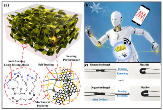 - Ma, D.; Wu, X.; Wang, Y.; Liao, H.; Wan, P.; Zhang, L. Wearable, antifreezing, and healable epidermal sensor assembled from long-lasting moist conductive nanocomposite organohydrogel. ACS Appl. Mater. Interfaces 2019, 11, 41701–41709. [Google Scholar] [CrossRef] [PubMed]