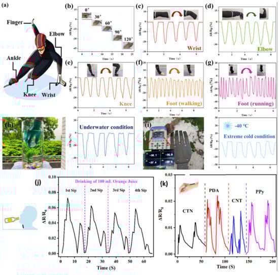 - Lu, D.; Liao, S.; Chu, Y.; Cai, Y.; Wei, Q.; Chen, K.; Wang, Q. Highly durable and fast response fabric strain sensor for movement monitoring under extreme conditions. Adv. Fiber Mater. 2023, 5, 223–234. [Google Scholar] [CrossRef]