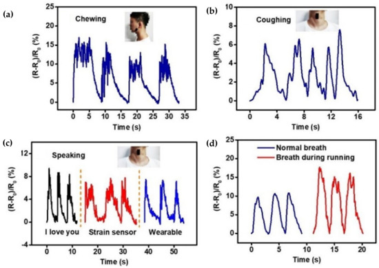 As technology continues to advance, strain sensors will play an increasingly vital role in various industries, such as aerospace, oil and gas, and civil engineering and health care. In space missions, deep-sea exploration, and mining operations, where human presence is limited or not feasible, strain sensors play a crucial role [29,30,31,32]. These sensors provide critical data on the structural integrity and performance of remote systems and equipment, ensuring the success and safety of these missions. By analyzing the strain data, engineers can assess the integrity of bridges, pipelines, aircraft, and other infrastructures. Moreover, strain sensors are employed in research and experiments conducted in extreme environments, such as high-temperature environments, high-pressure conditions, or corrosive atmospheres. They enable scientists to study materials and phenomena under these conditions, advancing our understanding of materials science and engineering. In industries with stringent safety regulations, such as nuclear power or aerospace, strain sensors are essential for compliance and certification. These sensors provide valuable data to ensure that components and structures meet safety standards and can withstand harsh conditions. In addition, as the population grows and the demand for healthcare increases, remote and personalized health monitoring gradually becomes the focus of attention, which can improve the accuracy of health diagnosis and also identify problems in time. Wearable strain sensors have been used extensively to monitor human physiological information, such as heartbeat, pulse, monitoring of respiratory and arterial signals, etc. [33,34].