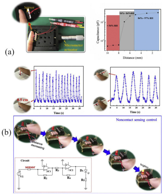 - The sensor sensitivity (S) is calculated by Equation (6) [106].where C11 is the sensor capacitance at 11% RH, and CX represents the capacitance of the sensor in the x% values.S = (CX − C11)/(RHx − RH11),