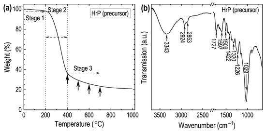 (a) TGA curve; (b) FTIR spectrum of the precursor Terminalia chebula seed powder. The upward arrows in panel (a) highlight the carbonization temperatures of the prepared carbon materials.