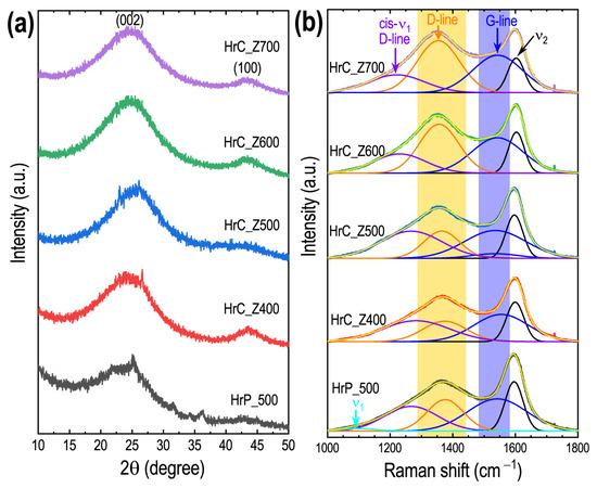 Figure 5b shows the experimental Raman scattering spectra of the prepared carbon samples with the fitting components. The Raman spectra exhibit the characteristic of amorphous carbons [59]. Peak fitting components reveal that the directly carbonized reference sample, HrP_500, can be fitted with a small peak at 1100 cm−1 corresponding to the polyenic structure. Moreover, all the spectra show amorphous carbon structures with D- and G-lines related to C–C and C=C vibrations [60]. Plateaus in the 1220–1270 cm−1 and 1350–1375 cm−1 regions correspond to the sum of the peaks related to the sum of amorphous carbon associated with D-line and cis-polyacetylene-related C–C vibrations (cis-ν1). Peaks at 1540–1545 cm−1 and 1590–1605 cm−1 can be attributed to the G-lines of amorphous carbons and C=C vibrations of polyenes. Note that the intensity of the D-line, which is attributed to the breathing mode of the graphitic structural unit, increases with increasing carbonization temperature from 400 to 700 °C, suggesting the increasing structural defects in the carbon frameworks. The FTIR spectra of the control non-activated material and the chemically activated materials exhibit similar vibrational bands related to C=C (str.) (Figure S7). The band intensity corresponding to surface functional groups decreased due to ZnCl2 activation and annealing.
