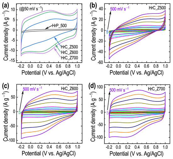 Based on their high specific surface areas, well-defined hierarchically micro- and mesoporous structures, and oxygenated surface functional groups, the electrochemical energy storage supercapacitance performances of the activated carbons were studied. Figure 6a shows the CV profiles of these carbon materials, including the reference material at 50 mV s−1. All the electrodes exhibit semi-rectangular CV profiles, inferring a largely EDLC-type behavior, which is commonly observed in carbon-based supercapacitors [61,62]. The non-rectangular-shaped CV curves with weak redox peaks observed at approximately 0.3–0.4 V can be attributed to a limited contribution of pseudocapacitive behavior to the EDLC. The presence of oxygenated functional groups in the carbon materials contributes to its pseudocapacitance. Note that the total internal current collected in the CV curve of the reference HrP_500 sample is low, but this increases with increasing carbonization temperature. The largest current collection in the HrC_Z700 sample suggests a highest energy storage capacity amongst these materials, which is in line with the surface area, i.e., carbons with higher specific surface area suggests better energy storage properties. CV responses recorded across a wide range of scanning rates (5–500 mV s−1) for the reference sample, HrP_500 (Figure S8) and the activated carbon samples HrC_Z500 (Figure 6b), HrC_Z600 (Figure 6c), and HrC_Z700 (Figure 6d) shows that total current output increases with increasing scan rate. A sustained quasi-rectangular profile at higher sweep rates suggests an enhanced electrolyte ion diffusion throughout the mesoporous channels in the electrode materials.