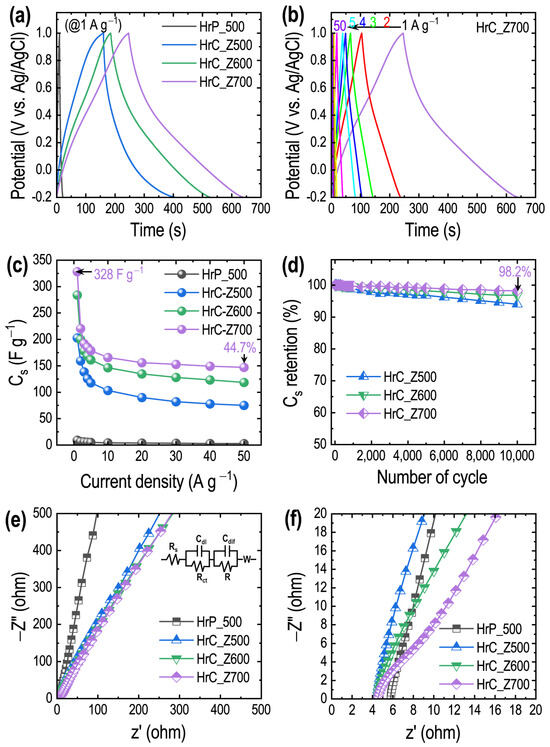 (a) Comparison of GCD profiles of the reference HrP_500 material and the ZnCl2 activated carbon materials; HrC_Z500, HrC_Z600, and HrC_Z700 at 1 A g−1,; (b) GCD vs. current density profiles for the material with optimal textural properties (HrC_Z700); (c) calculated specific capacitance vs. current density profiles; (d) cycle performance of selected materials; (e) Nyquist plots recorded at 5 mV amplitude; and (f) the corresponding expanded plot. Inset of panel (e) represent equivalent circuit diagram. Rs, and Rct represents electrolyte and charge transfer resistance, respectively. Cdl and Rct refer to the double layer formation, and Cdif and R represent the diffusion contribution. W represent Warburg diffusion.