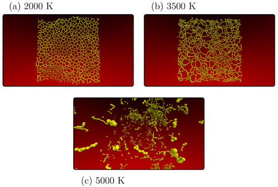 Figure 3c at 5000 K, we observe that the system has melted, resulting in multiple clusters comprising dispersed LACs scattered throughout the simulation box. At 7000 K, the system has transitioned into a gaseous state. See the