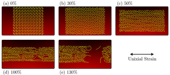 Figure 5d), the system takes on a highly porous quality characterized by extended LACs in the region that will eventually fracture entirely at 108%, as previously discussed. Finally,