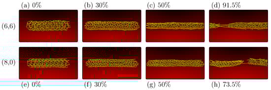 Figure 6d, at 91.5% strain, the system is on the verge of complete fracture, with only a few LACs remaining. The critical observation is the infinite nature of stress dissipation in the y-direction for monolayers. In contrast, despite their ability to adapt concerning diameter, nanotubes cannot as effectively accommodate changes in the direction perpendicular to the applied strain, particularly compared to the two-dimensional case. Consequently, despite a similar fracture pattern, nanotubes tend to fracture significantly earlier than the 2D case.