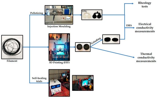 The TPU polymer matrix selected for the study was TPU Elastollan® 1164 D by BASF Polyurethanes GmbH (Ludwigshafen, Germany) (reference name: rTPU), originating from post-industrial scrap from injection moulding processes that was shredded and subjected to one reprocessing cycle. rTPU pellets were dried overnight at 60 °C before processing. Nanocomposites for the selected polymer matrix were prepared with three types of carbon-based nanofillers, namely: (i) MWCNTs produced in-house via the supported catalyst CVD method (reference name: MWCNTs_csCVD); (ii) in-house produced byproduct from the floating catalyst CVD synthesis of MWCNTs (reference name: MWCNTs_cfCVD_bp); and (iii) commercial MWCNTs (reference name: MWCNTs_com) supplied from Hongwu International Group Ltd. (Hong Kong, China), with average diameter of 20 nm and average length of 10 μm (average aspect ratio of 500). For the preparation of rTPU masterbatches, DMF solvent was employed for the solution mixing processes and was purchased from Sigma Aldrich. In addition, benchmarking formulations were prepared through the dilution of commercial masterbatch 10%CNTs/TPU PLASTICYLTM TPU1001 (reference name: mTPU_1001) purchased from Nanocyl SA, incorporating NC7000 MWCNTs (average aspect ratio of 157).