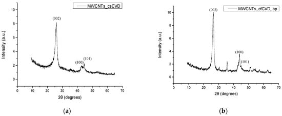 The XRD spectra of MWCNTs_csCVD (Figure 4a) show the characteristic peaks of the XRD spectra of carbon nanotubes, namely, the large sharp peak for 2θ = 26°, corresponding to crystallographic plane (002) diffraction of graphite, and the two united smaller sharp peaks for 2θ = 43–45°, reflecting crystallographic planes (100) and (101). In particular, the strong sharp peak for (002) reveals the graphitic structure of MWCNTs []. The XRD spectra of MWCNTs_cfCVD_bp (Figure 4b) also shows all the characteristic peaks of the XRD spectra of carbon nanotubes. However, it is worth noting that other smaller peaks at 2θ = 35° and >50° were present, which are likely related to impurities that introduce defect points in crystal lattice formation.