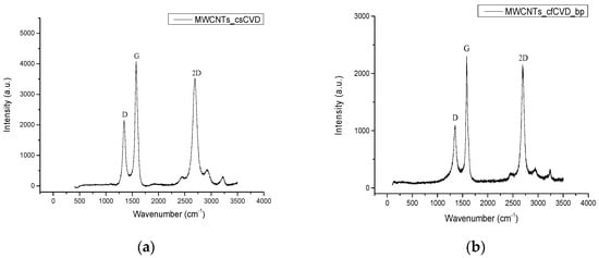 Raman spectra of (a) MWCNTs_csCVD and (b) MWCNTs_cfCVD_bp.