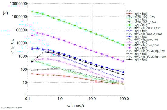 In terms of rheological response, higher values of complex viscosity in low-frequency ranges were observed for all compositions, which is indicative of a better performance in shape retention after material deposition. In parallel, as viscosity reduction provides a counter-balancing effect on reduction in voids and air gaps, compositions within the medium viscosity increase range (rTPU/MWCNTs_csCVD 1 & 10 wt& and MWCNTs_cfCVD_bp_10wt) were identified as a suitable compromise between processability and structural integrity. Overall, in the majority of nanocomposite samples investigated, a solid-like viscoelastictic behavior with G′ ≥ G″ is observed for the selected frequency range, which may be attributed to the liquid-to-solid transition due to the formation of a continuous network of nano-fillers in the polymer matrix, impacting the polymer chain relaxation.