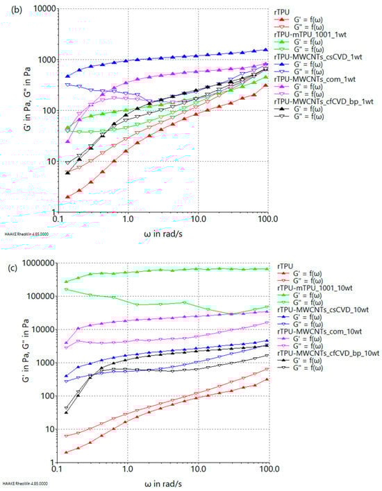 Figure 6 shows the frequency (ω) dependence of the storage modulus (G′), loss modulus (G″), and complex viscosity (η*) for 1 wt.% and 10 wt.% prepared samples measured at 240 °C. Consistent values of G′, G″, and η* within the FFF processing window are desirable for ensuring a uniform rheological response, with high-frequency range values associated with extrusion through the print nozzle and low-frequency range values associated with the bond consolidation process upon deposition []. With the increase in the content of each additive, all the studied values are increased, especially at low frequencies, as expected from the restraint on the mobility of the polymer chains and the possible formation of micro-defects introduced due to the interactions between the additives and the polymer matrix [,]. As shown in Figure 6a, viscosity increase and shear thinning behavior for 1 wt.% compositions (open symbols) are more pronounced for lab-produced MWCNTs_csCVD, followed by MWCNTs_com, while a moderate shear thinning effect is induced by the commercial rTPU/mTPU_1001_1wt. Shear-thinning behavior is crucial for avoiding shape instability and deformation during the 3D printing process [,]. Interestingly, this trend is reverted at the higher nanofiller content of 10 wt.%, where higher viscosity values with steep frequency dependence are observed for mTPU_1001_10wt. In the case of rTPU/MWCNTs_csCVD_10wt nanocomposites, a slight increase in shear thinning response is demonstrated with no significant increase in viscosity in comparison with the 1 wt.% concentration. This effect is considered a favorable characteristic for the development of high filler content nanocomposites for FFF technology, as feedstock materials should be able to be extruded through a small diameter (0.2–0.8 mm) printing nozzle; therefore, high viscosity increases may hinder material feeding and lead to flow instabilities or nozzle blockage. In parallel, higher values of complex viscosity in low-frequency ranges result in printed parts that exhibit better shape retention and mechanical integrity []. However, reductions in viscosity offers a counterbalancing effect associated with crossflow upon material deposition, and thus a reduction in voids and air gaps, which improves part structural integrity []. Consequently, viscosity should be kept within a medium ideally accompanied by a steep solid-to-liquid transition in order to simultaneously ensure a good level of interlayer adhesion and dimensional stability upon solidification [,]. In this context, compositions within the medium viscosity increase range (rTPU/MWCNTs_csCVD 1 & 10 wt& and MWCNTs_cfCVD_bp_10wt), may offer a suitable compromise between processability and structural integrity. Overall, in the majority of nanocomposite samples investigated, a solid-like viscoelastic behavior with G′ ≥ G″ is observed for the selected frequency range. In particular, in the highest contents of additives, it can be observed that G′ >> G″, which may be attributed to the liquid-to-solid transition due to the formation of a continuous network of nanofillers in the polymer matrix, impacting the polymer chain relaxation.