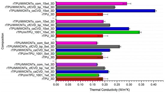 As a general trend that can be observed in Figure 7, as the concentration of nanofillers increases, the value of thermal conductivity also increases. Some deviations are observed at intermediate concentrations, which may be associated with the possible degradation of properties from the preceding processes (dispersion, extrusion, 3D printing). The highest thermal conductivity values are observed for rTPU/MWCNTs_csCVD_15wt nanocomposites, where thermal conductivity is more than doubled in comparison with the rTPU matrix. At 10 wt.% concentration, an improvement of thermal conductivity by 79% is demonstrated for mTPU_1001, followed by 56% for lab-synthesized MWCNTs_csCVD and 22% for byproduct MWCNTs_cfCVD_bp, while a non-significant increase is observed for commercial MWCNTs_com. Since the bonding of thermoplastic fibers is thermally operated, tailoring thermal conductivity is considered favorable for the FFF process, as it can allow more efficient heat transfer and material melting, thus improving print quality and reducing printing time []. Consequently, mTPU_1001_10wt is promoted by demonstrating the highest improvement of thermal conductivity, while lab-synthesized MWCNTs_csCVD and byproduct MWCNTs_cfCVD_bp also provide a favorable increase in thermal conductivity in combination with a desirable viscosity range, as discussed in the previous section.