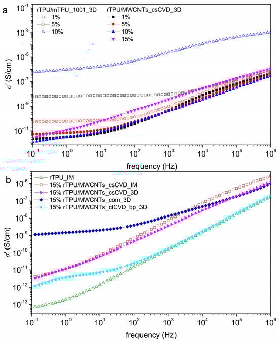 Variation in the conductivity (σ′) and as a function of frequency (Hz); (a) comparative plot of rTPU/MTPU_1001 and rTPU/MWCNTs_csCVD 3D-printed specimens and (b) comparative plot of specimens produced via injection moulding and 3D printing at 15 wt.% nanofiller content.
