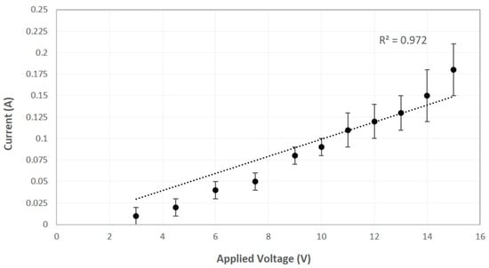 As shown in Table 6, it was observed that differential voltage allowed free electron flow through the conducting path of nanofillers, and heating via the Joule effect was shown to result in the conversion/loss of electrical energy in the form of thermal energy. Additionally, it can be observed that the temperature rise presents a linear trend versus the applied voltage, while a similar behavior is also demonstrated in the case of the current versus voltage relationship (Figure 9, with the consequence that nanocomposites can be assumed to follow Ohm’s law. By linear correlation, the resistance values of the mTPU_1001_10wt filaments are equal to 101.0 Ω. These resistivity values are consistent for polymer matrix nanocomposites with conductive fillers [], while the reduced resistivity value of the TPU-based nanocomposite indicates its increased conductivity.