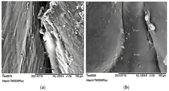 To investigate the self-healing ability of the above samples, artificial cracks were introduced on the surface of the sample, perpendicular to the direction of the electric current. SEM analysis took place at the crack location, to be used as a measure of the effectiveness of material remelting due to the Joule effect. The voltage source was set to be equal to 12 V for 10 min, where, within this interval, a current value of 0.12 A and a temperature close to 150 °C was recorded. It should be noted that at higher voltage, the temperature increased sharply and rapid degradation occurred. The samples were observed in SEM in order to evaluate the morphology of the artificial crack before and after heating with the Joule effect. As shown in Figure 10, in the mTPU_1001_10wt nanocomposites, it was revealed that the artificial cracks were partially restored.