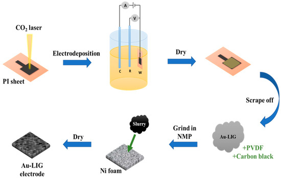 The fabrication of LIG on the Kapton (polyimide (PI)) sheet was achieved by using a CO2 laser cutting and engraving equipment operating at a wavelength of 10.6 μm. Prior to the fabrication process, the PI sheets underwent a comprehensive rinsing procedure with ethanol and water. As synthesized LIG was used as the working electrode in a 3-electrode cell, comprising of an Ag/AgCl reference electrode, and a platinum counter electrode. The electrolyte solution was prepared by dissolving 5 mM HAuCl4 in 1 mM H2SO4. The gold nanoparticles were deposited onto the LIG surface using cyclic voltammetry (CV) for 20, 50, and 100 cycles, in a voltage window of −0.3 V to 0.6 V (Figure S4). The working electrode was then dried and scratched to obtain the Au-LIG nanocomposites. A total of 5 mg of synthesized nanostructures were mixed with 5% carbon black with a dropwise addition of NMP and 5% PVDF to obtain a slurry which was further coated on nickel foam with an active area of 1 cm2. This slurry was pasted onto a nickel foam and dried to obtain the electrocatalysts. The schematic of the whole process is shown in Figure 1. The geometrical area for each electrode was kept as 1 cm × 1 cm.