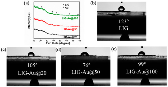 (a) shows the XRD pattern of fabricated LIG-Au nanostructures (b–e) water contact angle variation of LIG, LIG-Au@20, LIG-Au@50 and LIG-Au@100, respectively.