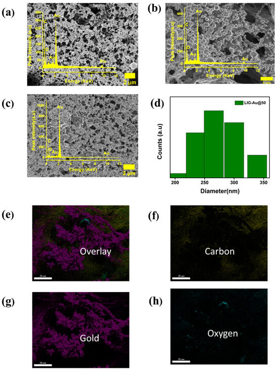 (a–c) Surface morphology analysis through FESEM of LIG-Au@20, LIG-Au@50, and LIG-Au@100 with inset shows qualitative EDS spectrum (d) size distribution histogram for LIG-Au@50 (e–h) elemental mapping of LIG-Au@50.