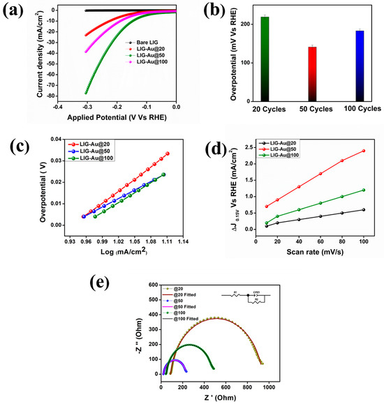 A qualitative comparison of CV scans in 0.5 M H2SO4 of all samples is shown in Figure 4d. The excellent value of ECSA for LIG-Au@50 (1.28 cm2) depicts a large number of available exposed locations for catalytic activity. Turnover frequency (TOF) pertains to the assessment of the number of hydrogen molecules generated per active catalytic site within a given time interval [44]. A greater TOF value signifies a more effective catalyst, a crucial factor for the use of the catalyst in real scenarios. It is observed that the LIG-Au@50 catalyst had a TOF value of 0.009 s−1 which is higher than the other materials (Table S1). Furthermore, the mass activities of the catalysts were determined using Equation (7). The obtained values indicate that the LIG-Au@50 exhibits superior performance, which is consistent with the findings of prior studies. Table 1 displays the performance metrics of all HER catalysts. Electrochemical impedance spectroscopy (EIS) has the capability to offer significant insights into the kinetics of the hydrogen evolution reaction (HER), specifically pertaining to the charge transfer resistance occurring at the interface between the electrode and electrolyte [45,46]. The lower the charge transfer, the faster will be the kinetic process. Figure 4e shows EIS spectra of fabricated catalysts in a frequency range of 0.01 Hz to 10 KHz. The inset of the graph represents the equivalent fitted circuit evaluating the values of charge transfer and solution resistance values. R2 represents the charge transfer resistance offered at the electrode electrolyte interface whereas R1 shows the solution resistance value. LIG-Au@50 offered the least Rct value as compared to 20 and 100 cycles. In the case of LIG-Au@50, the gold nanoparticles uniformly cover the LIG surface with no possibility of agglomeration leading to easy access to ionic movement. However, LIG-Au@100 consists of larger gold chunks which are further agglomerated causing difficulty for the movements of ions throughout. This phenomenon leads to the increase in the charge transfer resistance of LIG-Au@100 in comparison to 20 and 50 cycles and is also responsible for poorer catalytic activity.