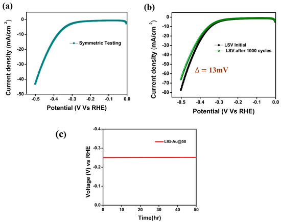 (a) LSV scan of a symmetric device fabricated using LIG-Au@50 electrode (b) CV scan was used to check the stability of the LIG-Au@50 catalysis over 1000 cycles of continuous operation (c) chronopotentiometry test at 50 mA/cm2 for 50 h.