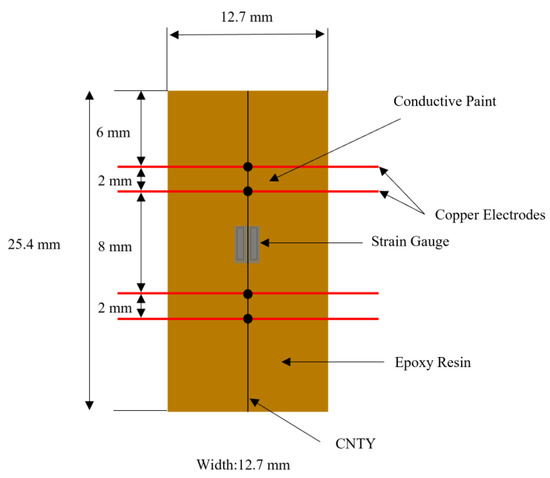 With a mixing ratio of 100:23 of resin and hardener, EPON 862 was mixed with Epikure W, and mixed in a beaker for 3 min. The mixture was heated to 130 °C for 15 min to eliminate air bubbles. Once the CNTY was straight and in place, previously mixed polymer was poured into the mold and it was inserted into a convection drying oven (Labnique, Hunt Valley, MD, USA) for curing. The specimens were cured using two-step heating cycles. During the first 2 h, the temperature was set to 100 °C and increased to 130 °C for the last 2 h of the heating cycle. The resulting specimens were 25.4 mm long, 12.7 mm wide, and 12.7 mm thick. Strain gauges were mounted on each side of the specimen as shown in Figure 2.