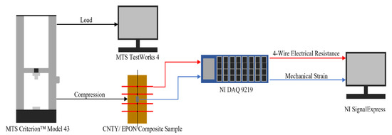 A MTS Criterion 43 electromechanical loading machine with a 30-kN capacity load cell, controlled by the TestWorks4 software, was used to apply the load to the specimens at various strain rates for at least five continuous compression cyclic loadings. All experiments were performed within the linear elastic regime of the polymeric material. The electrical resistance of the embedded CNTY was measured during the experiments using a four-point-probe measurement technique with an NI PXI-4072 (Austin, TX, USA) Inductance–Capacitance–Resistance (LCR) card mounted in an NI PXI-1033 chassis. The four copper wires were inserted inside the specimen and connected to the NI-PXI-4072 card using Bayonet Neill–Concelman (BNC) cables and electrical leads with mini-hooks. The electrical resistance (R) of the embedded CNTY was determined by using inner probes that measure the voltage (V) while a constant current (I) was applied using the outer probes. The strain was measured by connecting the strain gauges (attached to the mid-center of the specimen) to an NI-PXI 9219 card mounted on an NI cDAQ-9178 chassis. The experimental setup is shown in Figure 3. The applied load, strain, and electrical resistance were measured as a function of time. The data acquisition was conducted at 2 Hz using NI SignalExpress 2015 software. Five specimens of CNTY monofilament composite materials for each experiment were tested to ensure reproducibility.