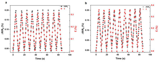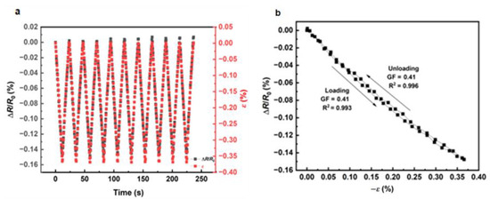 These results appear to indicate that the piezoresistive responses of the CNTY monofilament composite under tension and compression are substantially similar. For instance, Figure 10 shows there is an overlap between the relative electrical resistance change (∆R/R0) and strain (ε) versus time responses of the CNTY monofilament composites subjected to nine continuous tension cycles at a constant strain rate of 0.01 min−1 and 0.05 min−1, respectively.
