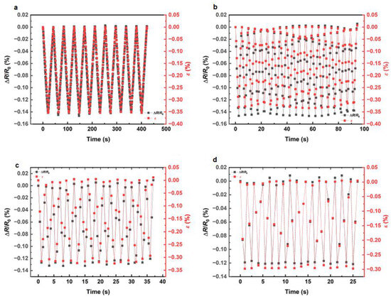 Based on previous studies that had shown a significant effect of the strain rate on the piezoresistive response of freestanding CNTYs under tension [16], a similar study was pursued to determine the effect of the strain rate on the piezoresistive response of the CNTY monofilament composites under axial compression. The specimens were subjected to compressive cycles at other strain rates, including 0.02 min−1, 0.2 min−1, 0.4 min−1, and 0.6 min−1. The relative resistance change (∆R/R0) and strain (ε) versus time responses of the CNTY monofilament composites at these four different strain rates are shown in Figure 5a–d. The compressive strain (ε) experienced by the specimen is plotted at the right vertical axis (red) while the relative change in electrical resistance (∆R/R0) is shown at the left vertical axis (black), both plotted as a function of time.