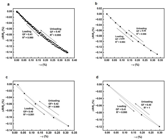 The results showed that for all strain rates, there was a decrease in ∆R/R0 during loading and an increase during unloading. At a strain rate of 0.02 min−1, the maximum strain was −0.36 ± 0.01%, and ∆R/R0 was −0.14%. For a strain rate of 0.2 min−1, the maximum strain was also −0.36 ± 0.01%, and ∆R/R0 was −0.15%. At a strain rate of 0.4 min−1, the maximum strain was −0.32 ± 0.02%, and ∆R/R0 was −0.13%. Finally, at a strain rate of 0.6 min−1, the maximum strain was −0.30 ± 0.02%, and ∆R/R0 was −0.12%. In all cases, the maximum strain was reached when the compressive load was 2000 N (12.4 MPa), and it returned to 0 at the end of the unloading segment.
