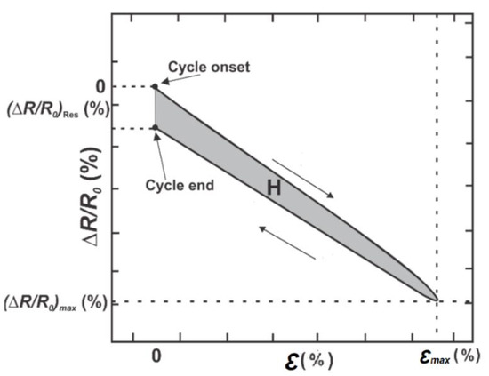 where HN is the normalized hysteresis, H is the area under the hysteresis loop, (ε)max represents the maximum strain achieved in each cycle, and (∆R/R0)max is the maximum change in electrical resistance associated with the strain. Table 2 shows the corresponding values of the calculated hysteresis parameters for each strain rate tested.