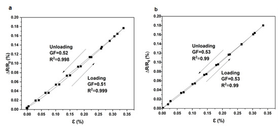 The sensitivity or gauge factor (GF) of the piezoresistive response of the CNTY monofilament composite is defined as the slope of the relative change of electrical resistance versus strain and can be calculated according to: