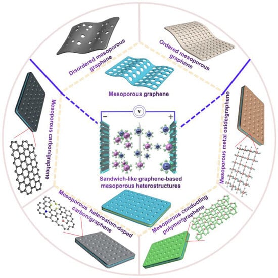 However, the van der Waals forces between different layers results in the easy self-stacking of graphene nanosheets and obvious decrease in specific surface area (SSA) and active sites, which hinder ion transport and lead to a significant reduction in electrochemical performance [,,,,,,]. Considering that mesoporous materials possess a high SSA, large pore volume, and tunable nanostructure [,,,,], introducing the mesopore structure into graphene to customize graphene-based mesoporous nanosheets (GMNs) will integrate the merits of graphene and mesoporous materials, restrain the restacking of graphene layers, and realize new physiochemical properties [,,,]. Therefore, GMNs are regarded as one ideal electrode material for high-performance SCs. Specifically, the mesopores can serve as ion transfer channels to reduce the diffusion resistance of electrolyte ions and thus realize good rate performance and power density for the SCs. Additionally, the mesopore networks endow GMNs with improved specific surface areas and active sites, as well as large pore volumes and reaction spaces. The high SSAs and abundant active sites enable electrolyte ions to be fully embedded and increase the effective contact area between the electrode and electrolyte, which can enhance the specific capacitance and energy density of the corresponding SCs. The large pore volume and sufficient reaction space can accommodate solvated electrolyte ions and buffer the volume change of the electrode during the charging/discharging process, delivering good cycling stability for the SCs [,,,,,,,,,]. Ultimately, these structural advantages endow GMNs with a high specific capacitance, good rate capacity, exceptional cycling stability, and improved power and energy densities for SCs. Although recent advances in graphene for energy storage and conversion have been summarized [,,], a comprehensive overview of the synthesis and SC applications of GMNs is still lacking.