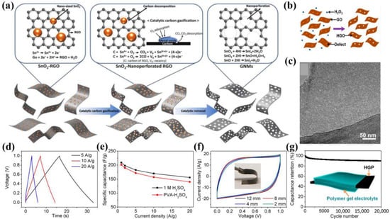 Analogously, Xu et al. [] used a mild defect-etching reaction to produce in-plane holey graphene oxide (HGO), in which GO and H2O2 were mixed and reacted at 100 °C for 4 h (Figure 2b). The transmission electron microscopy (TEM) image revealed numerous planar pores of several nanometers on the HGO surface (Figure 2c). And nitrogen adsorption–desorption tests demonstrated a much higher SSA (~430 m2/g) compared to GO (~180 m2/g), along with a prominent size distribution in 2–3 nm. Considering the significantly improved SSAs and ion diffusion dynamics compared to the non-porous counterparts, the HGO could serve as binder-free supercapacitor electrodes with ultrahigh electrochemical performances in various electrolytes. With the poly (vinyl alcohol) (PVA)-H2SO4 gel electrolyte, the HGO-based SCs demonstrated a specific capacitance of 201 F/g at 1 A/g, exceptional flexibility even at a bending radius of ~2 mm, and an outstanding cycling stability of ~90% of retention after 20,000 cycles under the bending state (Figure 2d–g).