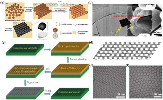 (a) Schematic of the preparation, and (b) TEM and SEM images of the ordered mesoporous graphene []. (c) Schematic of the fabrication of ordered GNM through block copolymer photolithography, (d) schematic of the structure, and (e,f) TEM images of GNM with 39 nm periodicity and 7.1 nm neck width [].