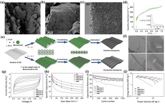 (a,b) SEM images, (c) TEM image, and (d) nitrogen adsorption/desorption isotherm of graphene-based mesoporous carbon []. (e) Schematic of the preparation; (f) TEM images of OMC/GA with different mesopore orientations; (g) CV curves; (h) specific capacitance versus current density; (i) cycling stability; and (j) Ragone plots of SCs based on OMC, GA, and different OMC/GA [].