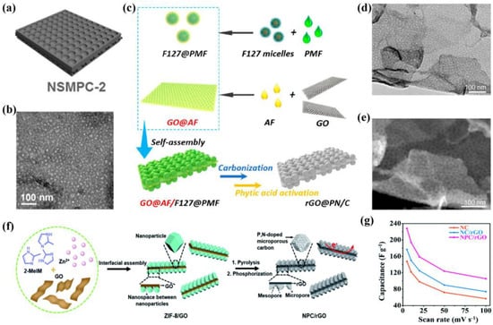 In addition, polyatom-doped mesoporous carbon/graphene was developed and applied in SCs [,,]. For instance, Xu et al. [] prepared nitrogen–sulfur co-doped mesoporous carbon/graphene with a uniform mesopore structure (10 nm) using a 2D mesopore dual-template method (Figure 6a,b). Unluckily, the composite was not used in SCs, but as a carbon-based catalyst for oxygen reduction reaction (ORR). Moreover, Tan et al. [] used GO as a 2D substrate, F127 as a soft template, and resin and phytic acid as organic precursors to synthesize phospho-nitrogen co-doped mesoporous carbon nanosheets (rGO@PN/C) (Figure 6c). Notably, the doping amount of nitrogen and phosphorus was 1.9 at% and 0.5 at%, the thickness was 27.8 nm, the mesopore diameter was ∼14 nm, and the SSA was 1116.7 m2/g, respectively. Meanwhile, TEM and high-angle annular dark-field scanning transmission electron microscopy (HAADF-STEM) confirmed that the introduction of the phosphorus element did not change the morphology of mesoporous nanosheets (Figure 6d,e). Owing to the high SSA, low thickness, rich mesopore structure, and phospho-nitrogen co-doping, the rGO@PN/C exhibited high activity and rapid mass transfer for ORR. Furthermore, Guo et al. [] reported porous phospho-nitrogen co-doped carbon/graphene heterostructures (NPC/rGO) using metal–organic framework (MOF)-nanoparticles as a precursor through stepwise pyrolysis and phosphorylation process (Figure 6f). In the NaCl aqueous electrolyte, the NPC/rGO presented the highest specific capacitance of 228 F/g at 5 mV/s compared to contrast samples (Figure 6g). Therefore, polyatom-doping of mesoporous carbon/graphene may exhibit better electrochemical properties compared with single heteroatom-doping, and their applications in SCs will be an important research direction in the future.