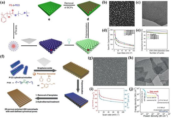 Apart from the hard template of SiO2 nanospheres, soft templates (e.g., micelles of surfactants or block copolymer) can also be used to prepare nitrogen-doped mesoporous carbon/graphene. For example, Zhang et al. [] synthesized 2D GO@nitrogen-doped mesoporous carbon (GO@NMC) using a simple, multistage, and self-assembled strategy, where poly-diaminopyridine (PDAP) acted as both carbon and nitrogen precursors, the polystyrene-b-polyethylene oxide (PS-b-PEO) block copolymer served as mesopore templates, and GO worked as a structural guide for 2D morphology (Figure 5d). After high-temperature carbonization (700 °C), GO@NMC with a mesopore range of 8–25 nm and N content of up to 19 wt% was produced (Figure 5e). Using it as an active electrode material, the resulting GO@NMC-based SCs displayed a specific capacitance of ~256 F/g at 0.2 A/g and excellent cycling stability for 5000 cycles (Figure 5f,g). In addition, the triblock copolymer of Pluronic P123 was used as a soft template to prepare mesoporous nitrogen-doped carbon/reduced GO (mNC/rGO) nanosheets. Specifically, P123 firstly formed columnar micelles in water, and then the micelles and dopamine (DA) molecules co-assembled on the GO surface through hydrogen bonding and electrostatic interactions. Through polymerization of DA, removal of P123, and hydrothermal treatment, mesoporous polydopamine/rGO (mPDA/rGO) was successfully obtained, and then mNC/rGO was received after further high-temperature carbonization treatment (Figure 5h). From transmission electron microscopy (TEM), it could be seen that the curved cylindrical mesopores were evenly distributed on rGO nanosheets (Figure 5i). Furthermore, with the mPDA/rGO positive electrode and mNC/rGO negative electrode, the prepared lithium-ion capacitor (LiC) exhibited excellent electrochemical performance, e.g., an energy density of 208 Wh/kg at a power density of 176 W/kg, which was the highest value of the recently reported PDA-based LICs (Figure 5j).