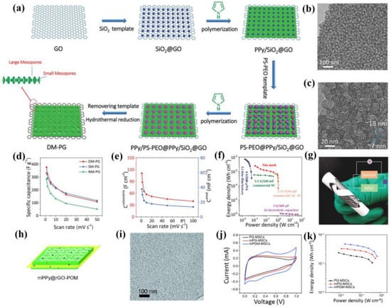 Furthermore, phosphomolybdate (POM) redox molecules can be introduced into mesoporous conducting polymer/graphene to further improve the electrochemical performance of electrode materials and the corresponding SCs [,]. From this, Wu’s group successfully prepared mesoporous PPy/graphene nanosheets with redox POM anchoring (mPPy@rGO-POM) using a soft template method for planar MSCs with enhanced volumetric capacitance []. Firstly, vermicular mesoporous mPPy@GO nanosheets were synthesized using P123 block copolymer as the mesopore template. After POM impregnation and the hydrothermal process, an mPPy@rGO-POM with low thickness (~3 nm), large SSA (142 m2/g), abundant mesopore structure, and uniform POM loading was obtained (Figure 8h,i). Further, the mPPy@rGO-POM-based MSCs presented a high areal capacitance of 115 mF/cm2 and volumetric capacitance of 137 F/cm3, as well as an outstanding energy density of 4.8 mWh/cm3 and power density of 645.1 mW/cm3 (Figure 8j,k). This strategy was expected to open up many possibilities for designing high-performance GMNs and building next-generation, flexible energy storage devices.