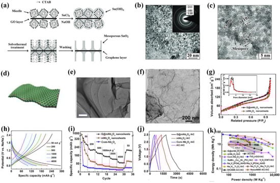 (a) Schematic for the formation and (b,c) TEM images of G-M-SnO2 []. (d) Schematic diagram of the structure and (e) TEM image of mTiO2/GO []. (f) TEM image, (g) nitrogen adsorption/desorption isotherms, (h) GCD profiles, (i) rate performance of G@mNb2O5 nanosheets, (j) GCD profiles at 0.05 A/g, and (k) Ragone plots of G@mNb2O5//AC device with other representative sodium-ion hybrid SCs [].