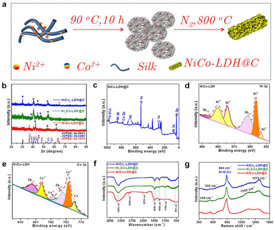 (a) Schematic diagram of the Ni2Co-LDH@C preparation via a two-step method. (b) XRD pattern of the NixCoy-LDH@C; (c) XPS survey of the Ni2Co-LDH@C catalysts; (d) the spectra of Ni2p; (e) the spectra of Co2p; (f) the FT-IR spectra of the NixCoy-LDH@C catalysts; (g) Raman spectra of the NixCoy-LDH@C catalysts.