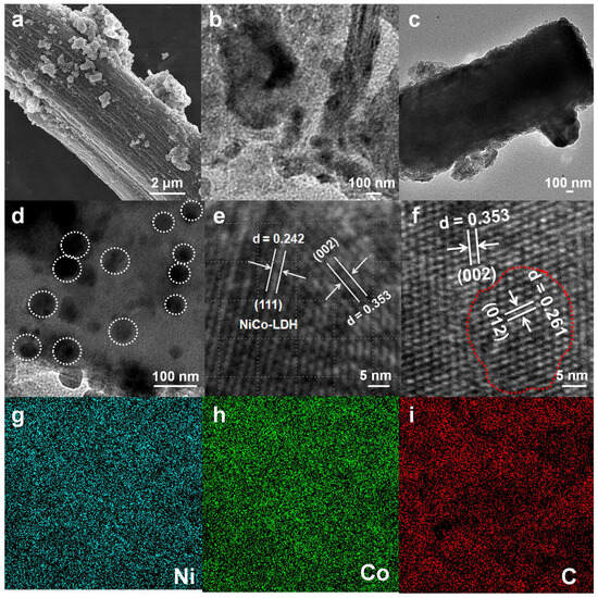 (a) SEM of the Ni2Co-LDH@C catalysts. Scale bar: 2 μm. (b) TEM of the carbonization of silk. (c,d) TEM of the Ni2Co-LDH@C catalysts. Scale bar: 100 nm. (e) HRTEM of the Ni2Co-LDH catalysts. (f) HRTEM of the Ni2Co-LDH@C catalysts. Scale bar: 5 nm. (g–i) Mapping of Ni, Co, and C elements.
