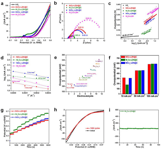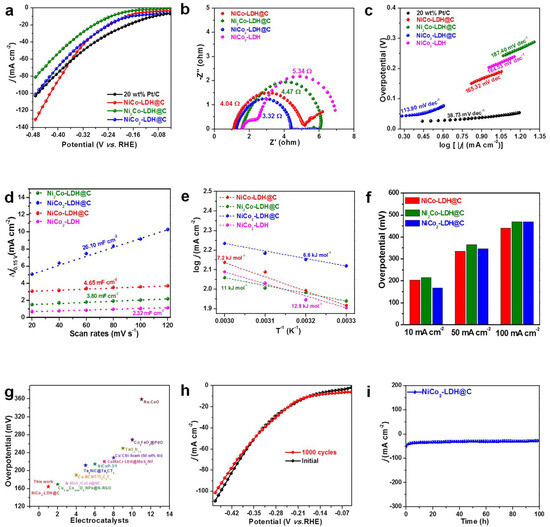 The HER of the catalysts was studied in 1 mol/L KOH solution. Figure 3a showed NiCo-LDH@C, Ni2Co-LDH@C, NiCo2-LDH@C, and Pt/C. As expected, Ni2Co-LDH@C showed the highest HER activity among the three synthesized catalysts, and the current density of 10 mA cm−2 only needed 164.8 mV overpotential. However, NiCo2-LDH@C and NiCo-LDH@C require 232 and 181.6 mV, respectively. Figure 3b shows the corresponding EIS for these catalysts. The Rct of Ni2Co-LDH@C was 3.32 Ω, indicating that the interface electron transfer rate of Ni2Co-LDH@C was faster, and it could maintain a low overpotential even at a high current density. The Tafel of Ni2Co-LDH@C was 113.9 mV dec−1, which was lower than NiCo2-LDH@C (242.8 mV dec−1) and NiCo-LDH@C (230.49 mV dec−1), 20 wt% Pt/C (38.7 mV dec−1) (Figure 3c). Under the same current density of 10 mA cm−2, the Ni2Co-LDH@C catalyst exhibited significantly higher current density compared to catalysts with different molar ratios of components and outperformed commercial 20 wt% Pt/C catalysts. These results indicate that the prepared catalyst with a molar ratio of 2:1 demonstrates superior electrocatalytic activity for HER. The results showed that NiCo2-LDH@C had the fastest reaction rate. In addition, Ni2Co-LDH@C performance was better than many Ni-based catalysts (Table S3). These results indicated that the interfacial effect of Ni/Co heterostructure and the three-dimensional structure composed of carbon materials were conducive to enhancing the hydrogen evolution activity of the catalysts [36,37]. In order to compare the intrinsic activity of the catalysts, the electrochemical active surface area (ECSA) of catalytic activity was normalized. ECSA was proportional to the double layer capacitance (Cdl) of the catalyst (Figure S2), using CV curves at different scanning rates, the Cdl values of the NiCo-LDH@C, NiCo2-LDH@C, and Ni2Co-LDH@C can be calculated as 4.65 mF cm−2, 3.80 mF cm−2, and 26.10 mF cm−2, respectively. Ni2Co-LDH@C had a lower activation energy of only 6.6 kJ/mol compared to the remaining two catalysts. It was considerably smaller than NiCo2-LDH@C (11 kJ/mol), NiCo-LDH@C (7.2 kJ/mol), and Ni2Co-LDH (12.8 kJ/mol), and the adsorption of hydrogen by Co is overly strong, resulting the low activity of electrocatalytic decomposition of aquatic hydrogen. Comparing the electrocatalytic activities of several catalysts with current densities of 10 mA·cm−2, 50 mA/cm−2, and 100 mA·cm−2, Ni2Co-LDH@C had the lowest overpotential (Figure 3f). The Ni2Co-LDH@C catalyst had the lowest hydrogen evolutionary excess potential compared to similar published catalysts. To verify the stability of the sample, after circulating the catalyst for 1000 cycles, the coincidence degree of the curve elevated and practically no shift is present, indicating perfect stability. As shown in Figure 3i, at the initial current density of 10 mA·cm−2, the sample showed no obvious attenuation after 12 h.