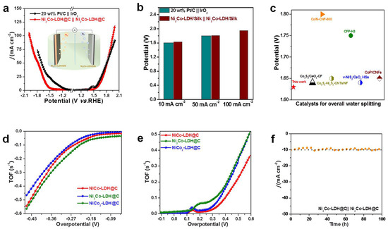 Ni2Co-LDH@C‖Ni2Co-LDH@C were used as both cathode and anode catalysts for the water splitting reaction. Figure 5a showed the polarization curves of its catalyst reaction. Ni2Co-LDH@C‖Ni2Co-LDH@C required only 1.63, 1.82, and 1.94 V to obtain current densities of 10, 50, and 100 mA cm−2, respectively (Figure 5b). In addition, the performance of the Ni2Co-LDH@C‖Ni2Co-LDH@C catalyst was better than others reported (Figure 5c). The above results indicate that Ni2Co-LDH@C‖Ni2Co-LDH@C had excellent HER and OER stability. The intrinsic catalytic performance of Ni2Co-LDH@C‖Ni2Co-LDH@C electrode was evaluated by oxygen turnover frequency. The cyclic voltammetry diagram showed the linear relationship with the scanning rate. The cyclic voltammetry (Figures S3–S5) showed that the oxidation peak of the sample had a linear relationship with the scanning rate, after fitting with LSV (Figure 5d). Table S5 shows that the oxygen turnover frequency of NiCo-LDH@C was 0.0103 s−1 and that of NiCo2-LDH@C was 0.0216 s−1. Ni2Co-LDH@C reached 0.0597 mol O2 s−1 under the overpotential of 190.6 mV. Table S6 shows the oxygen turnover frequency of NiCo2-LDH@C‖NiCo2-LDH@C, which reached 0.0615 mol O2 s−1 under the overpotential of 181.6 mV (Figure 5e). The catalysts with a three-dimensional array structure supported on the loose and porous surface of the carbon materials facilitated the exposure of the active site and the escape of bubbles as well as contact with the electrolyte. Under the same conditions, the performance of nickel-based transition metal electrocatalysts is better than most of the previously reported nickel-based transition metal electrocatalysts (Table S7). The voltage test experiment (Figure 5h) shows that the Ni2Co-LDH@C‖Ni2Co-LDH@C electrodes had good stability of total solution water at 1.66 V, and the potential change can be ignored. Figure 5f shows the overall water splitting performance of the device over 100 h (producing O2) and the cathode (producing H2); the two-electrode catalyst showed good stability.