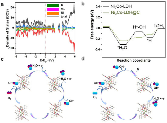 (a) DOS of Ni2Co-LDH@C; (b) Gibbs free-energy diagrams of HER intermediates for Ni2Co-LDH@C; (c) Schematic diagram of HER mechanism; (d) Schematic diagram of OER mechanism.